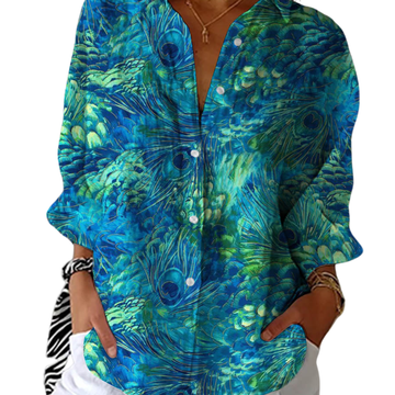 The Genesis blouse embodies grace and boldness with a striking peacock feather pattern in rich shades of turquoise and emerald green.