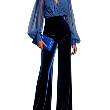 The Ella jumpsuit combines the luxurious look of deep blue velvet with refined mesh details and an elegant V-neck.